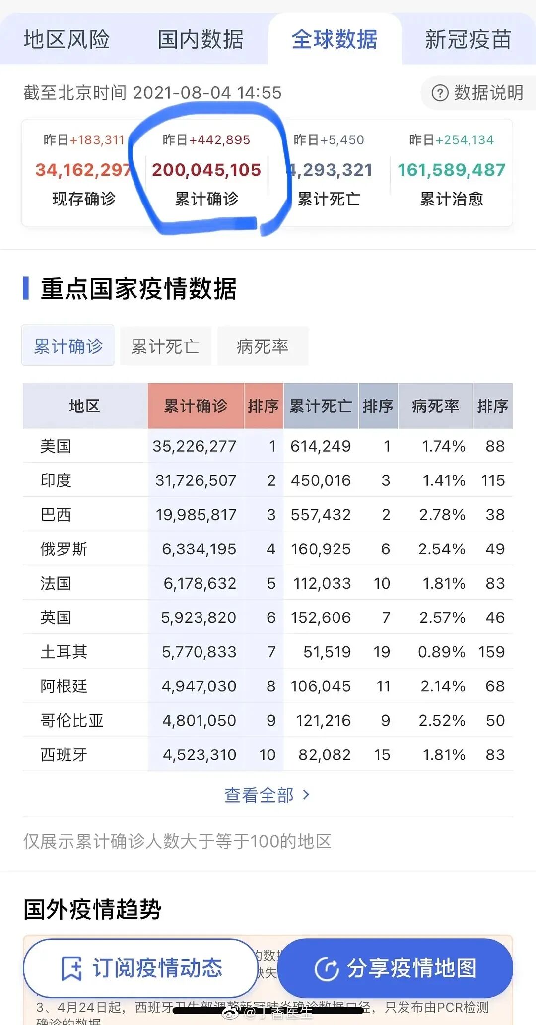 全球现在感染人数已经超过两亿人。这是什么概念?这意味着全球每二十个人中已有一个确诊者。而且数字还将继续增大。