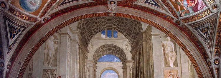 [16世纪初,负责圣彼得大教堂与梵蒂冈宫的总建筑师是拉斐尔的叔父布拉曼特。他为了让拉斐尔来罗马一显身手,说服了教皇尤里乌斯二世,请这个年仅25岁的画家前来罗马完成教皇办公室(包括图书馆)内一系列壁画。