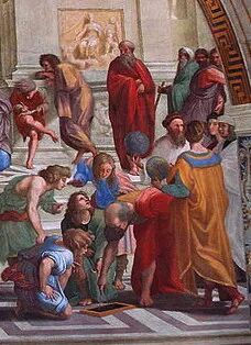 据说:欧洲文艺复兴时,意大利“艺术三杰”中年龄最小的拉斐尔(1483—1520年)曾经画过一幅著名的名画《雅典学院》(The School of Athens),表现的是古希腊时期百家争鸣、学者相互切磋的景象。