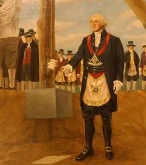 下图是美国开国总统华盛顿身着大长老、教父(Master Mason)的法仪服装,他右手中所持是共济会的象征法器——泥瓦匠(“石匠”)的抹铲: