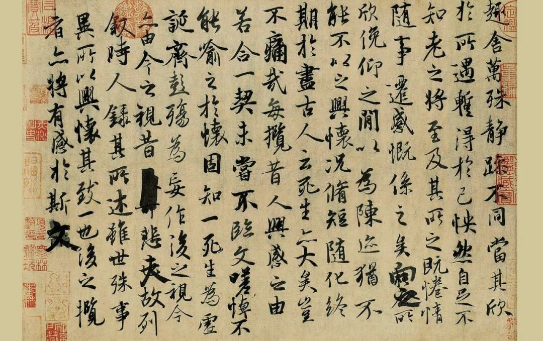 "怏(yang)然"二字,《古文观止》异文作“快然”。因此,有自作聪明而好事者乃谓王羲之写错了字,把“快然”写作“怏然”,“快然”是快乐,而“怏然”则是郁闷不快的意思。