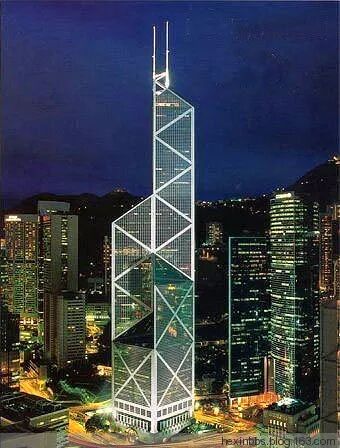 贝聿铭设计的香港中银大厦吸纳有方尖碑及规矩交叉的设计意涵