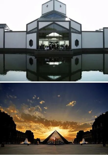 贝聿铭设计的苏州博物馆暗涵独眼金字塔理念(上图)