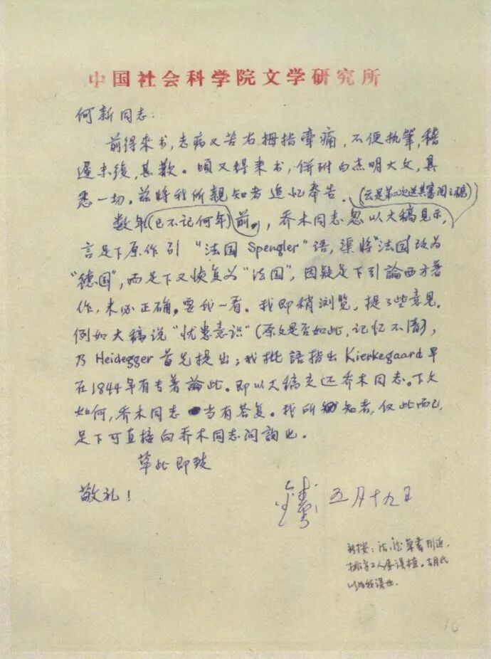 數年前(已不記何年),喬木同志忽以大稿見示(云是第二次送其審閱之稿),言足下原作引“法國Spengler”語,渠將“法國”改為“德國”,而足下又恢復為“法國”,因疑足下引論西方著作,未必正確,要我一看。我即稍瀏覽,提了些意見。例如大稿說“憂患意識”(原文是否如此,記憶不清),乃Heidegger首先提出。我批語指出Kierkegaard早在1844年有專著論此。即以大稿交還喬木同志。下文如何,喬木同志當有答復。我所知者,僅此而已,足下可直接向喬木同志問詢也。