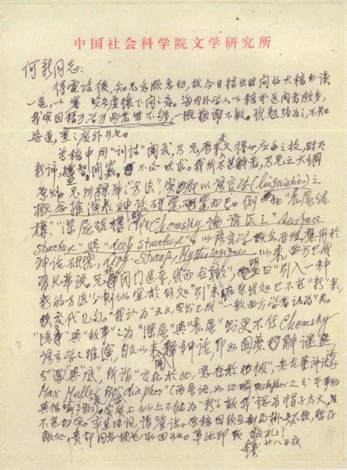 *此信所評指《一組古典神話的深層結構》文,刊《文學遺產》1986年第1期。