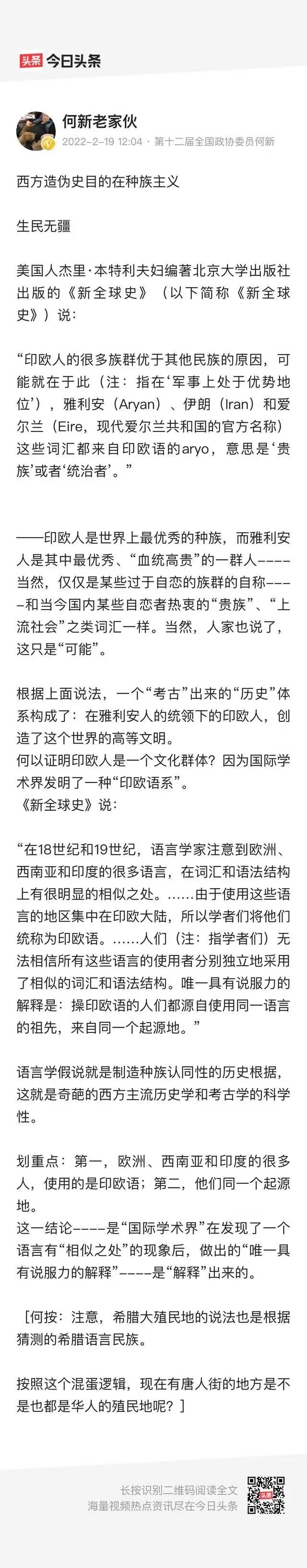 所以才能根据所谓梵语、波斯语与北欧日耳曼语的语法结构近似关系,捏造虚构出一个优越的雅利安种族。这不是我胡说,此论就在目前流行的主流哈佛版《全球通史》中。证据可看看楼上我转发的“生民无疆”那篇揭露文章。