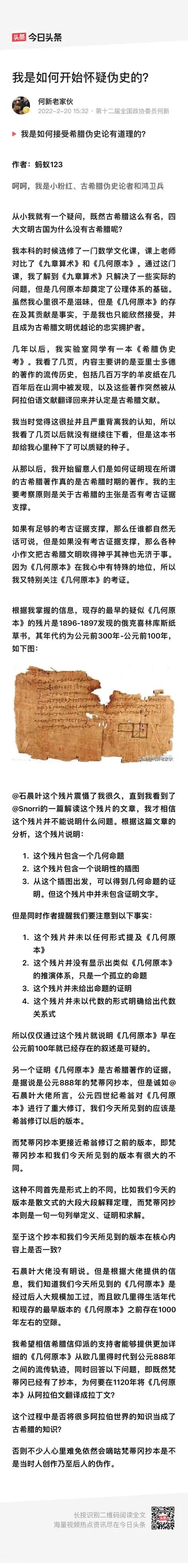 (【后附图2】图片:我推荐这个小盆友写的这篇文章《我是如何开始怀疑伪史的?》,何新老家伙今日头条转载文章,作者:蚂蚁123)