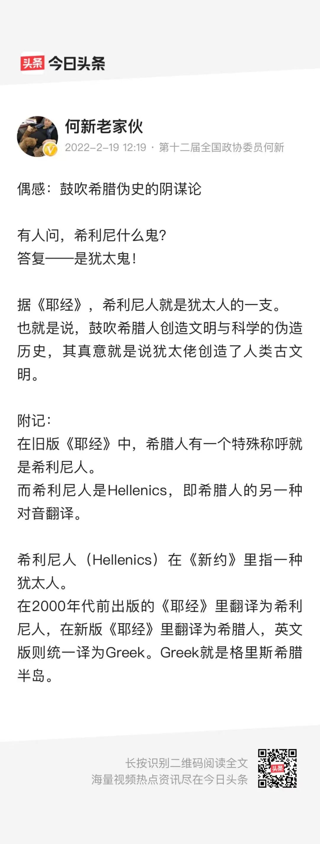(【后附图5】图片:《偶感:鼓吹希腊伪史的阴谋论》。何新老家伙今日头条文章,220219)