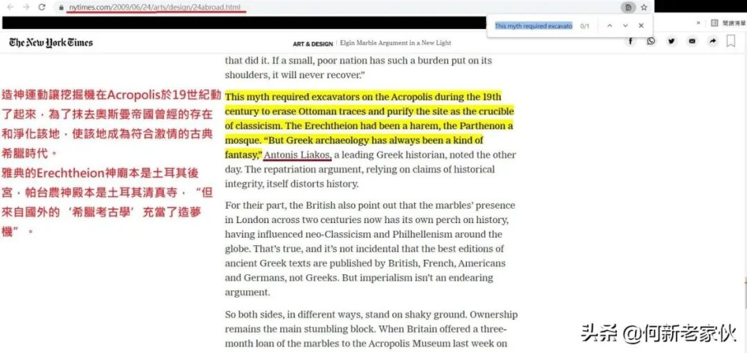 希腊史学家安托尼思·莱寇斯Antonis Liakos说:“雅典的伊瑞克提翁神庙,本是土耳其统治者的后宫,帕台农神殿(按即所谓雅典娜神庙)、本是土耳其的一座大清真寺”。