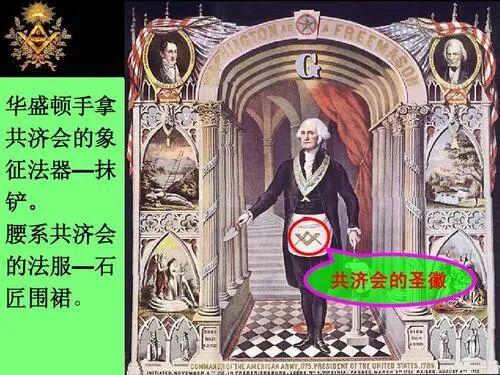 美国开国总统乔治·华盛顿,他是美国费城共济会的master,33级建筑大师,下图收藏于美国首都的华盛顿纪念馆中。华盛顿身穿石匠围裙,手持瓦刀和抹子。