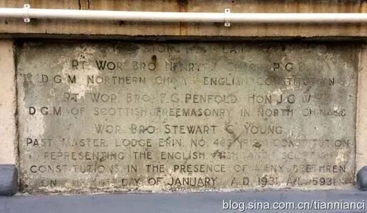 上海北京西路英国共济会旧址的奠基石,结尾铭刻时间:1931,光明纪年5931年