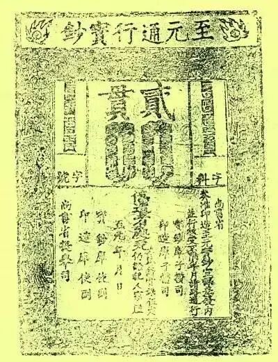 元末顺帝至正十年(公元1350年)发行“至正交钞”,一贯合“至元钞”二贯或铜钱一千文。初以“中统钞”加盖至正钞字样发行,无钞本,为首次法定的不兑现纸币。