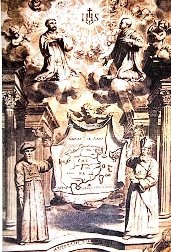 图中小天使打开的地图,系大清朝,两边人物南怀仁(清官服者)与利玛窦(儒服者)。