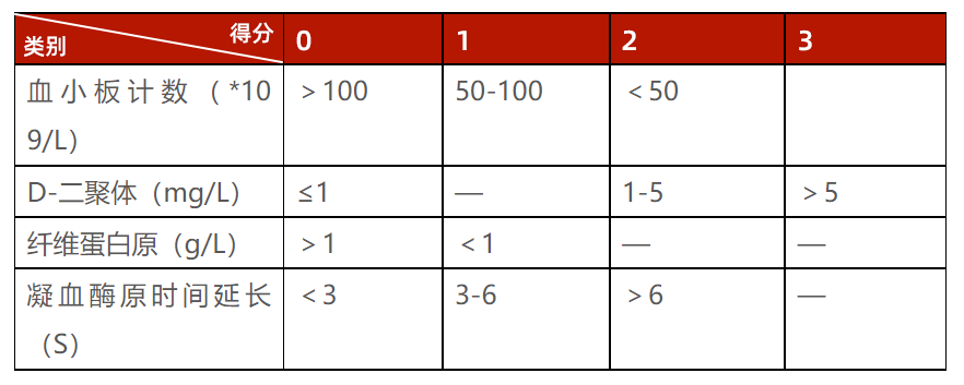 DIC的诊断可参考国际血栓与止血协会发布的评分准则(见表1),该准则评分范围为0-8分,得分≥5分的患者有DIC的可能。