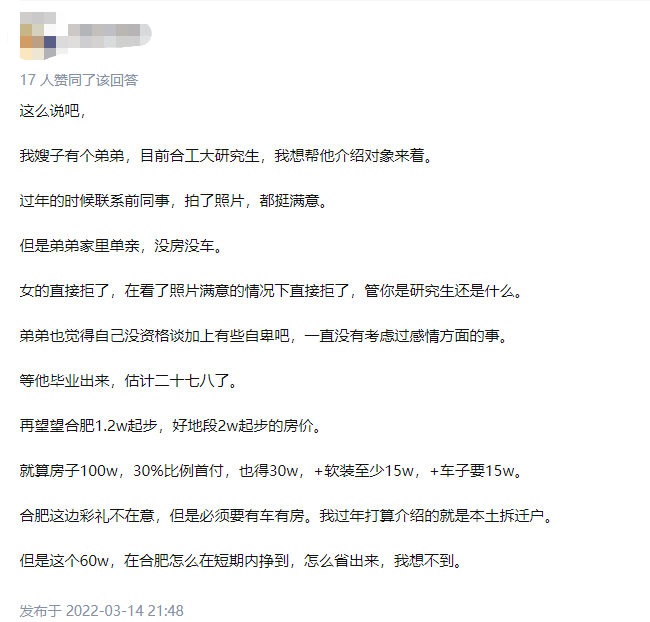 一安徽网友说,给研究生学历的弟弟介绍对象,由于没房没车,直接被拒绝。在合肥,哪怕不考虑彩礼,房子100W,3成首付30W,软装15W,车子15W,结婚就得60W起步。