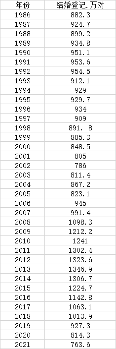这是继2019年跌破1000万对、2020年跌破900万对大关后,结婚登记对数再次跌破800万对大关。这一数据创下1986年以来的新低。