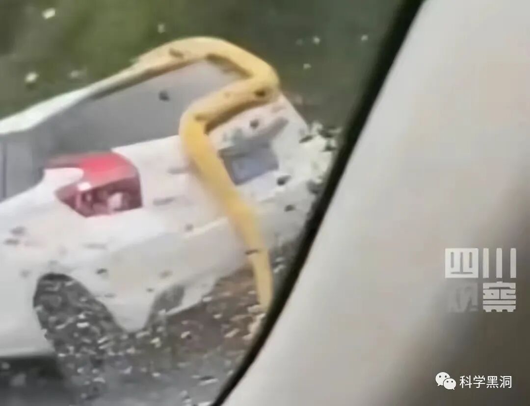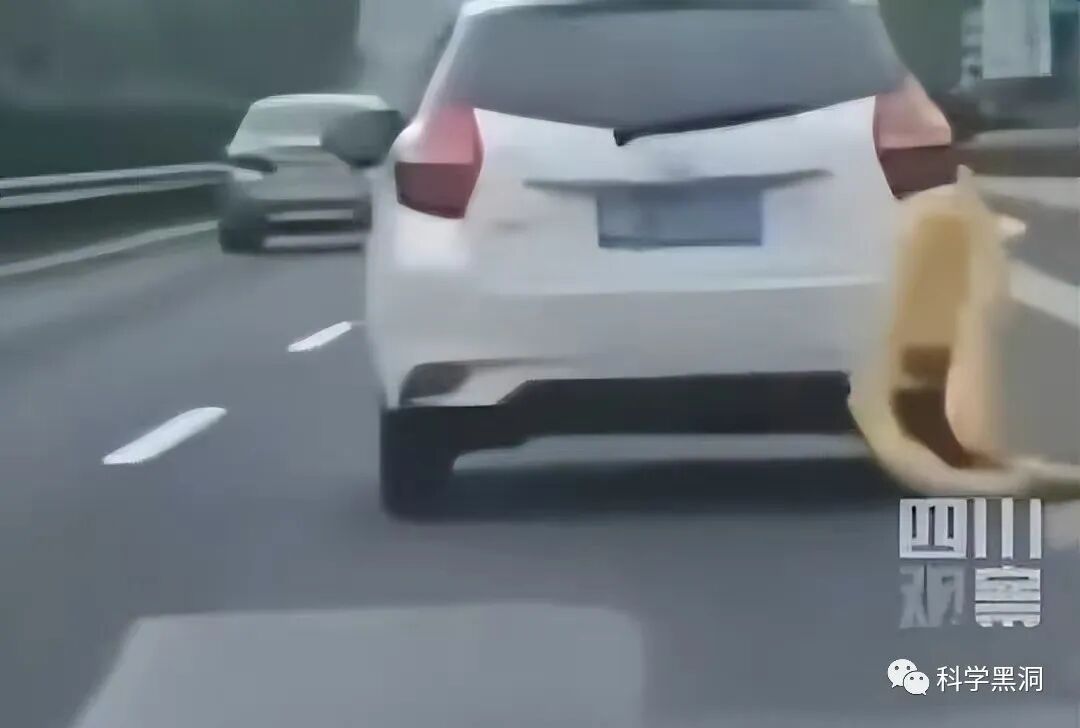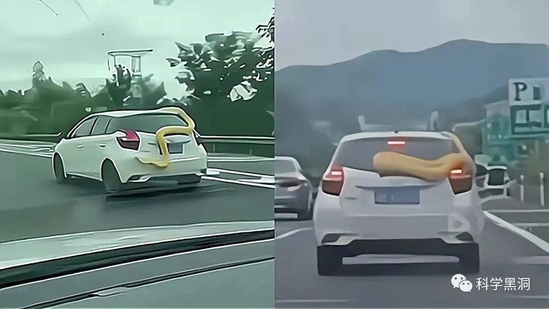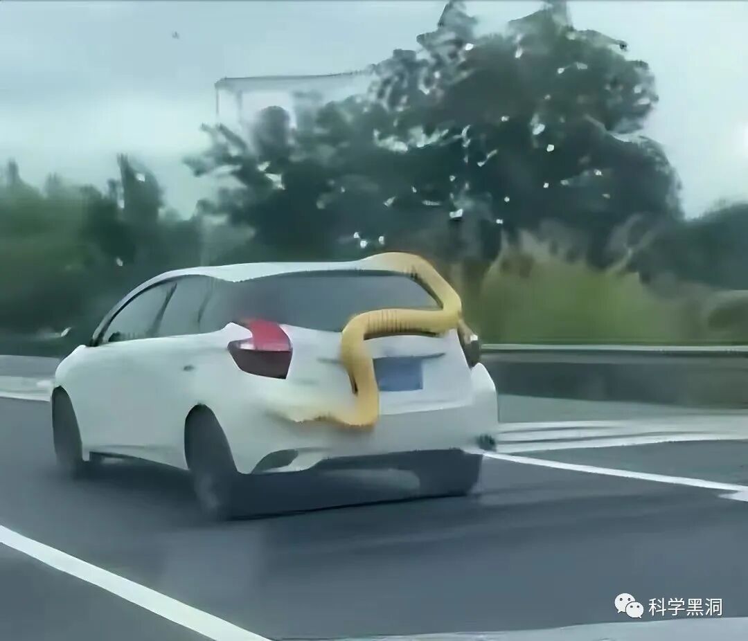 其实从画面中可以看到,这条体型巨大的蟒蛇大概率是从高速行驶的白色SUV中爬出来的,从前窗沿着汽车的侧壁爬行,根据目击者的回忆,这条大蟒蛇移动的速度并不慢,由于受到汽车侧面风速的影响,它是向着车辆后部分移动,最后当大半个身体都爬出窗外后便掉落在地面上。