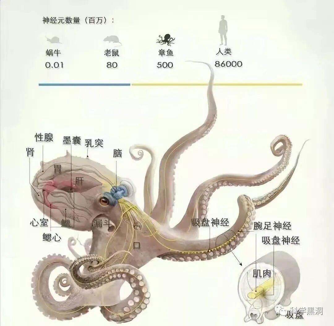 03、5亿个神经元赶超一些哺乳动物,我们知道神经元是生物的神经细胞,是构成神经系统最基本的结构和功能单元,从某种意义上来说它也能代表一种生物的聪明程度,当然是越多越好。但是作为无脊椎动物,章鱼的神经元数量的确有些超标准了。