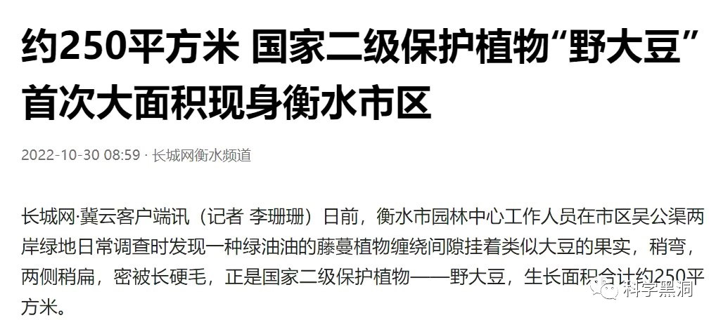 最近两个月,河北省衡水市园林中心的植保科研究人员对市内野生植物资源进行普查的时候,分别在吴公渠岸边、滏阳河衡水市区段岸边、植物园三个位置发现了野生大豆的存在,总面积合计约250平方米。