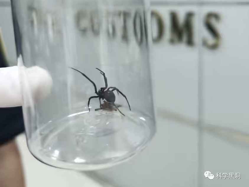 按照正常的工作流程,检查工作停止,立刻对封闭集装箱进行消杀工作,在后续的搜寻中,工作人员发现了一只“漏网之鱼”,这只黑色的活体蜘蛛经过辨认原来就是被称为“黑寡妇”的蜘蛛品种,其毒性极强。