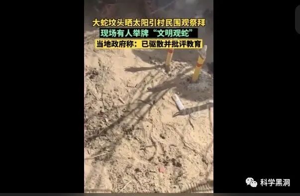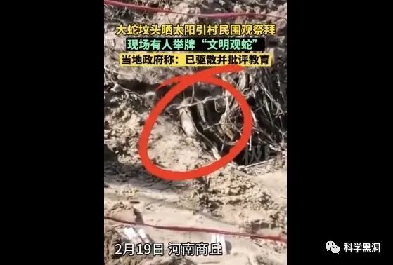 在河南省商丘市宁陵县柳河镇的某一村庄,有村民最早在2021年1月24就在坟头上发现了一条大蛇,前后大约持续了一个月,每天上午10点多出现在那里,下午三点多就爬行离开,这吸引了附近村民前往围观。围观的过程中还有人祭拜,这是不可取的迷信行为,但是当吃瓜群众看一看还是可以的。