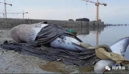 从画面中可以看出来,已经有人用黑布一样的物体把这头小须鲸尸体遮盖住,这是一种简单但是相对有效的防护措施,避免在等待处理或者搬运过程中发生爆炸,最终对附近人员造成影响。
