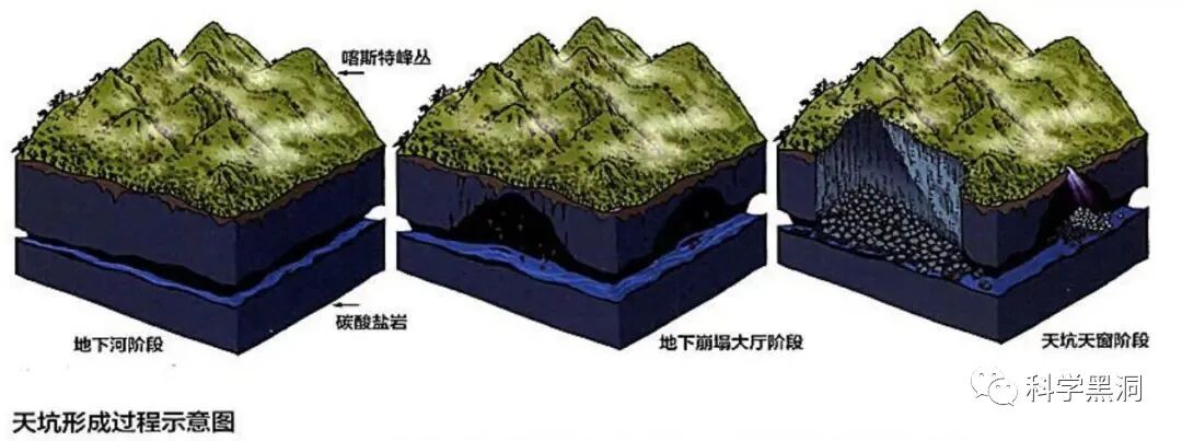 科学上来讲天坑就是喀斯特地貌或者说是岩溶,简单来理解就是水对岩石的冲刷溶蚀作用。