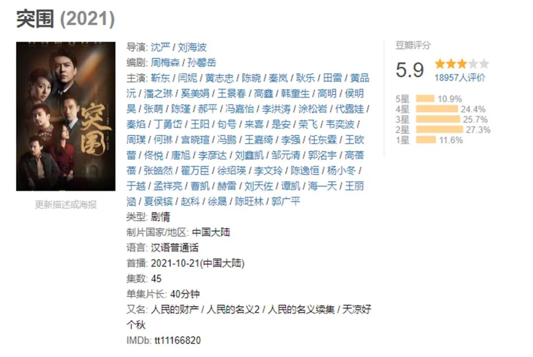 播了20多集的反腐题材剧《突围》,豆瓣终于开分了,只有5.9,接近80%评分集中在2星到4星,1星和5星都是11%左右,稳定的三角形,分数还是挺靠谱的。