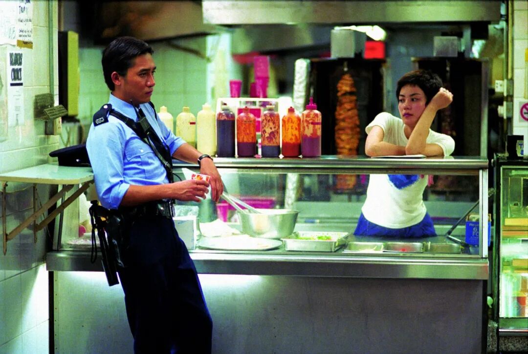 王菲在《重庆森林》中,饰演一位速食店打工的个性女孩阿菲,暗恋每晚来买宵夜的警察663(梁朝伟),而当时663有一个空姐女朋友(周嘉玲)。