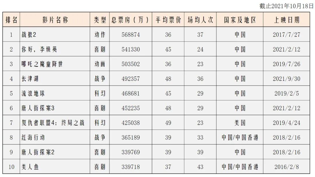 从场均总票房这个重要指数来看,目前《长津湖》的票房含金量最高。