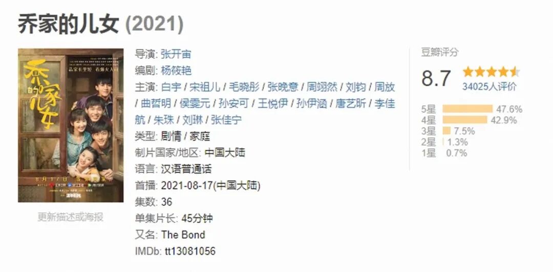 开播一周后,家庭情感剧《乔家的儿女》豆瓣开分8.7,比同期热播中的《扫黑风暴》7.8和《理想之城》7.7,差不多都高出了一个身位。