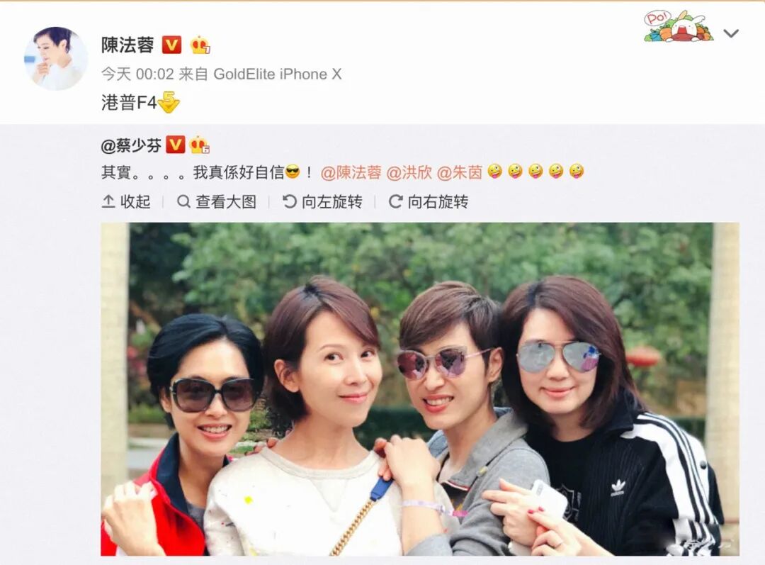 不知什么时候开始,陈法蓉、朱茵、蔡少芬、洪欣四位昔日女神,因为多年的闺蜜情,经常聚在一起,再加上极具特色的港味普通话,被内地观众亲切地称为港普F4。