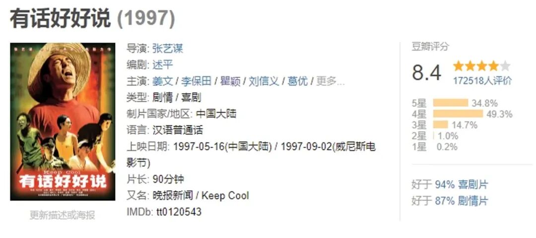 后来,很多人批评张艺谋的电影总讲不好故事,其实他还是很会讲故事的。《有话好好说》不仅证明张艺谋会讲故事,还能拍喜剧电影。