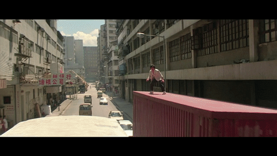 比如,《警察故事2》中,成龙从一辆大货车顶跨越到另一辆大巴车顶,再跃起躲过一块广告牌,然后马上躺下躲过第二块广告牌;接着,马上起身,穿过玻璃跳进街边的一栋大楼。