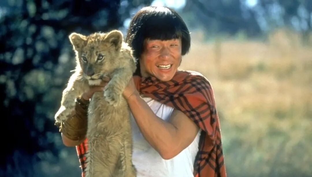 那次是真的遇到狮子了,而且是野生的母狮,成龙抱着它的崽子。