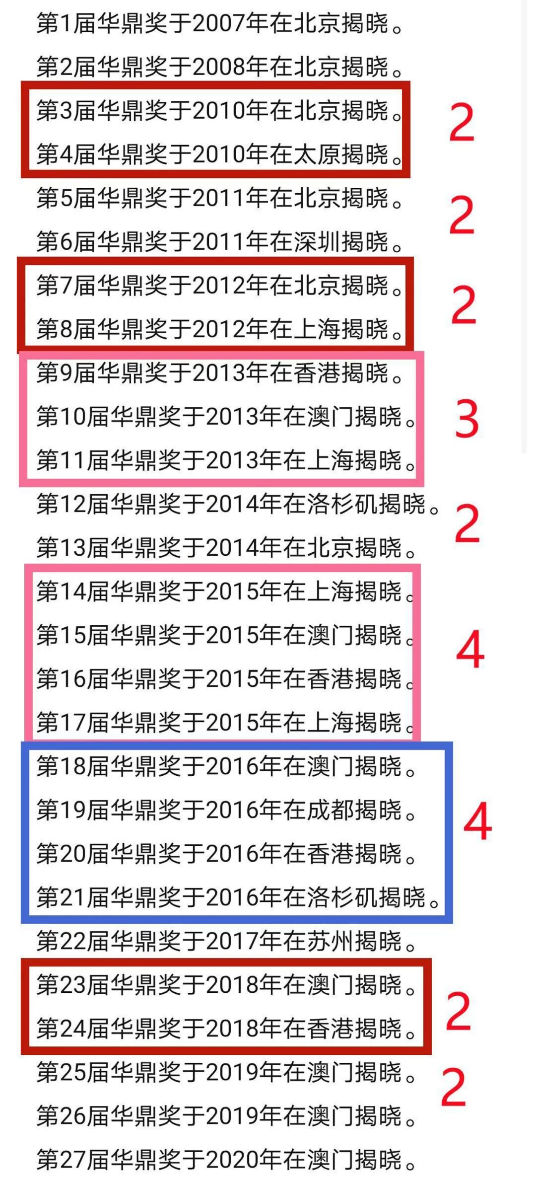 华鼎奖每年0届到4届不等,电影、电视和歌坛的奖项都有,甚至还是一个面对全球的国际奖项;可是它的奖项都是自己设的,哪些作品哪些明星能入围,最后又是谁获奖,都是自己定的。