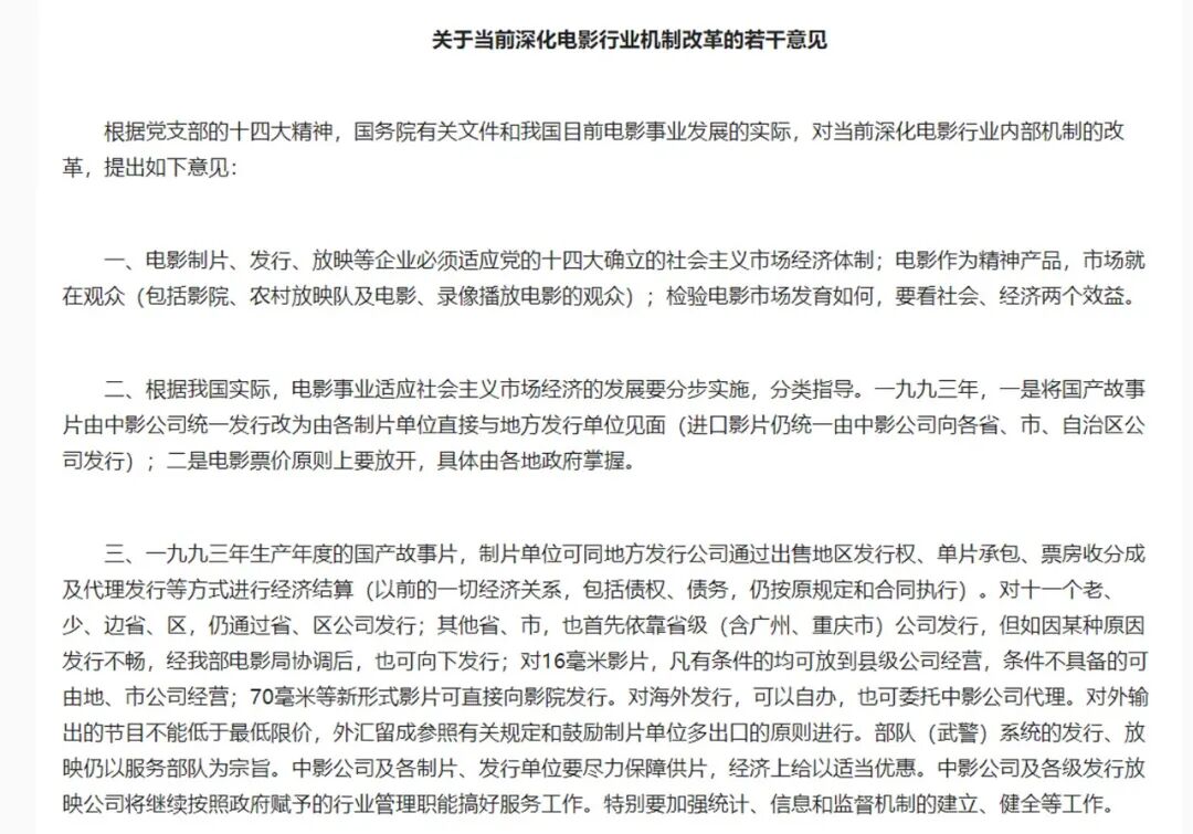 1993年1月5日,广电部发布了《关于当前深化电影行业机制改革的若干意见》(以下简称《意见》)的通知,宣布了10条对中国电影行业影响深远的重要决策。