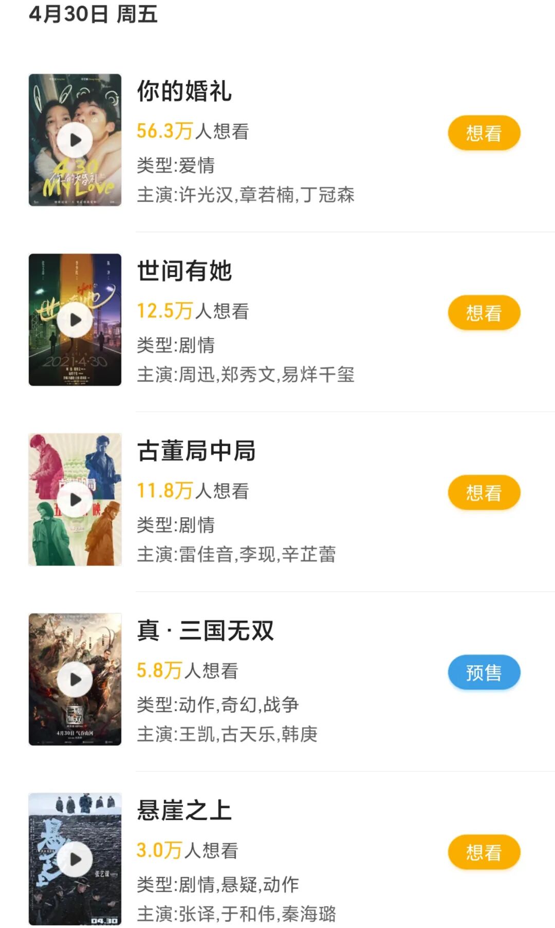 最后还有一部刚刚宣布,从5月20日提档到4月30日的《你的婚礼》,许光汉、章若楠主演。