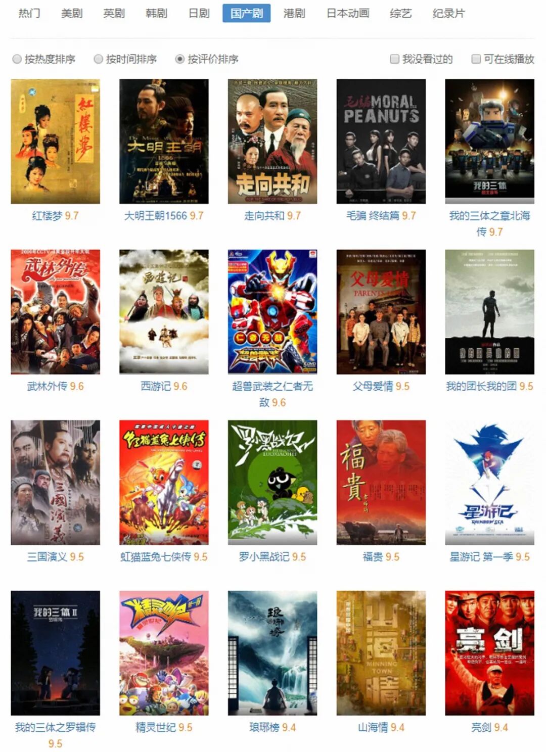 所以,在豆瓣上国产电影的最高分是9.6,只有1部《霸王别姬》;国产电视剧的最高分是9.7,共有5部,分别是1987年版的《红楼梦》、《大明王朝1566》、《走向共和》、《毛骗终结篇》和动画片《我的三体之章北海传》。