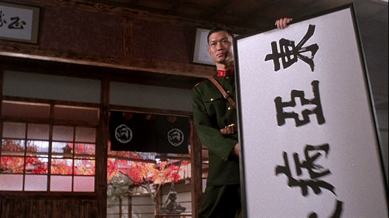 一帮日本武士,带着“东亚病夫”的牌匾来找死,最后周星驰用神奇右手一拳把日本武士打飞,还让汉奸翻译把“东亚病夫”的纸吃掉,大快人心。