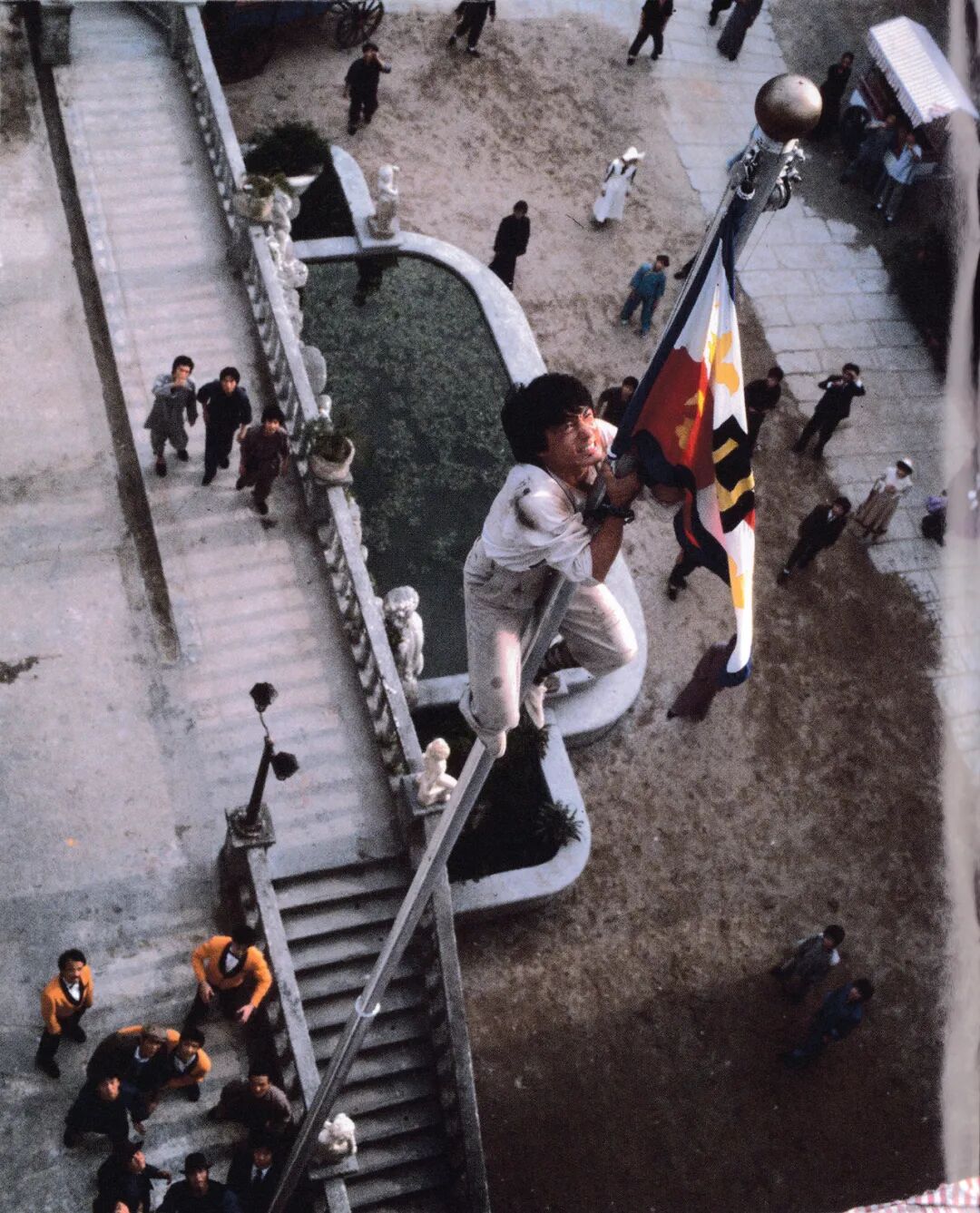 更要紧的是,当初这个跳楼的镜头,足足拍了7天,因为成龙始终不敢跳。最后,是大师兄洪金宝到场逼了他一把,才让成龙完成了这惊天一跳。