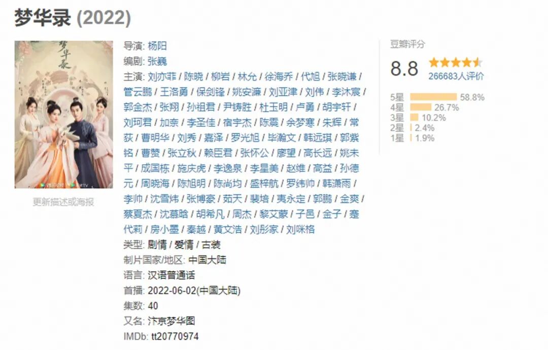 豆瓣冲到8.8分,日均播放量过亿,全网话题和热度第一,神仙姐姐刘亦菲主演的古装剧《梦华录》,绝对是2022年度的第一部大爆款。