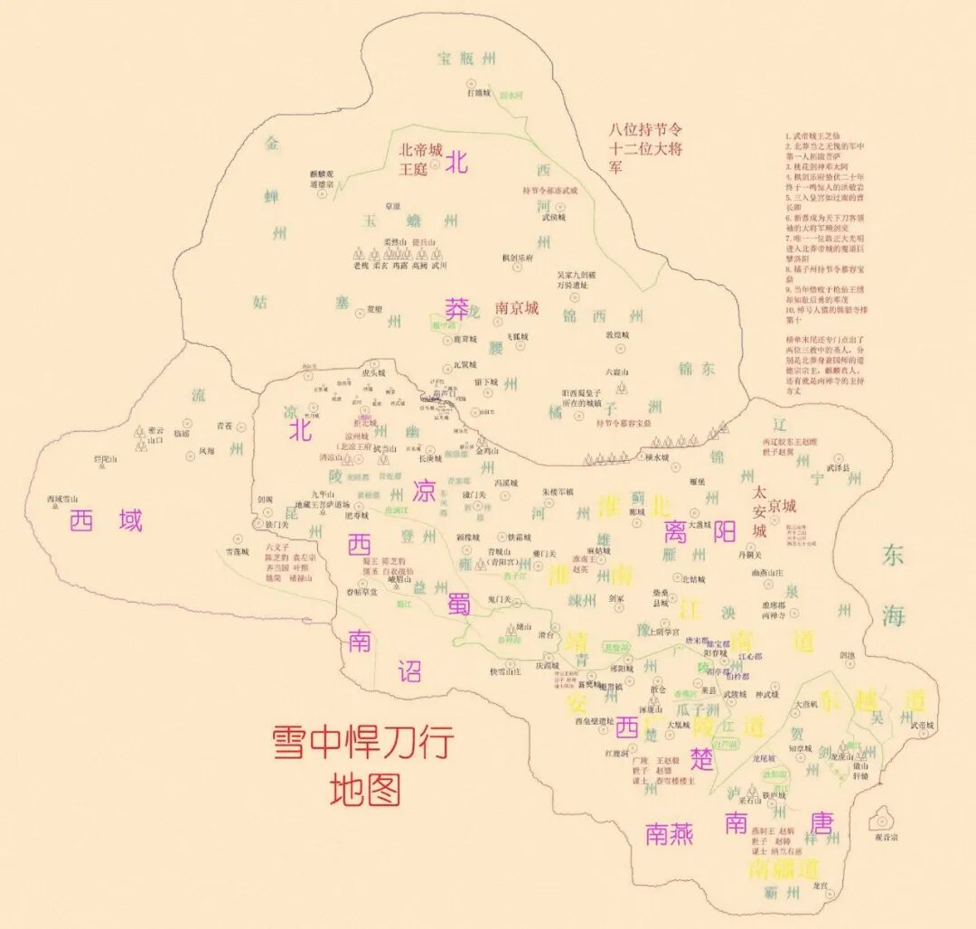 根据《雪中悍刀行》粉丝绘制的一份地图,北椋地处西北,而徐凤年此行最终的目的地是东海边的武帝城,一路是向东而行。