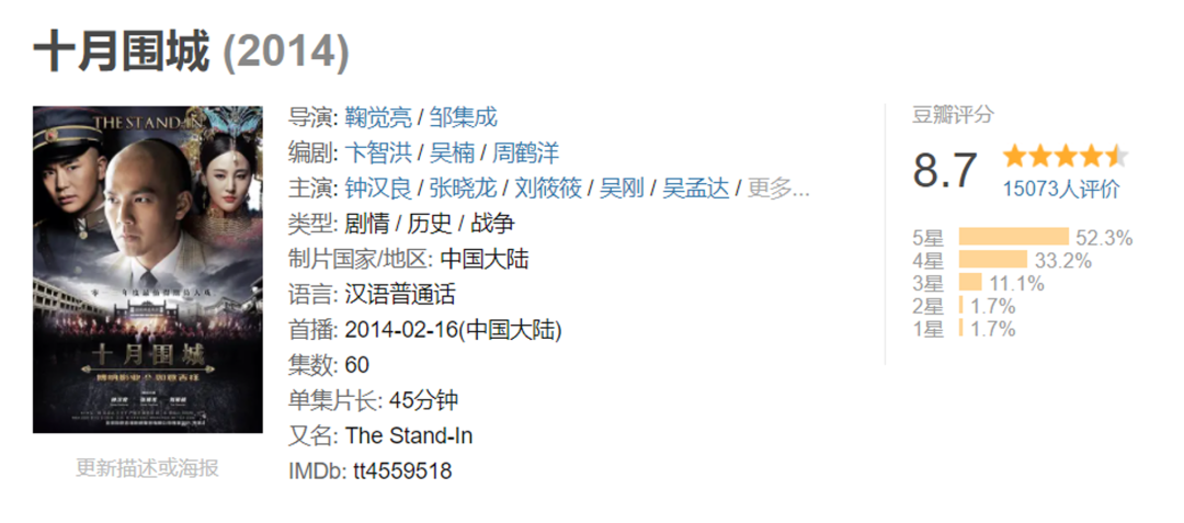 2009年电影《十月围城》7.7分,2014年电视剧《十月围城》8.7分