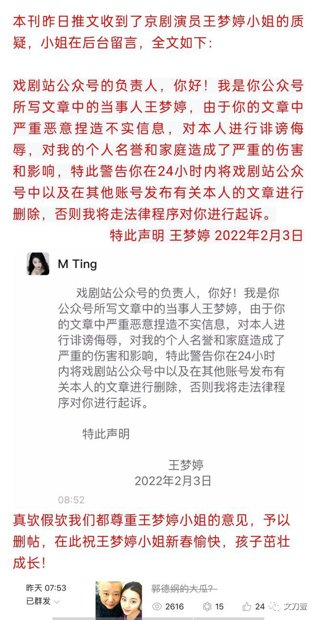 女方的资料被扒出来,王梦婷——郭德纲旗下唱戏的艺人。
