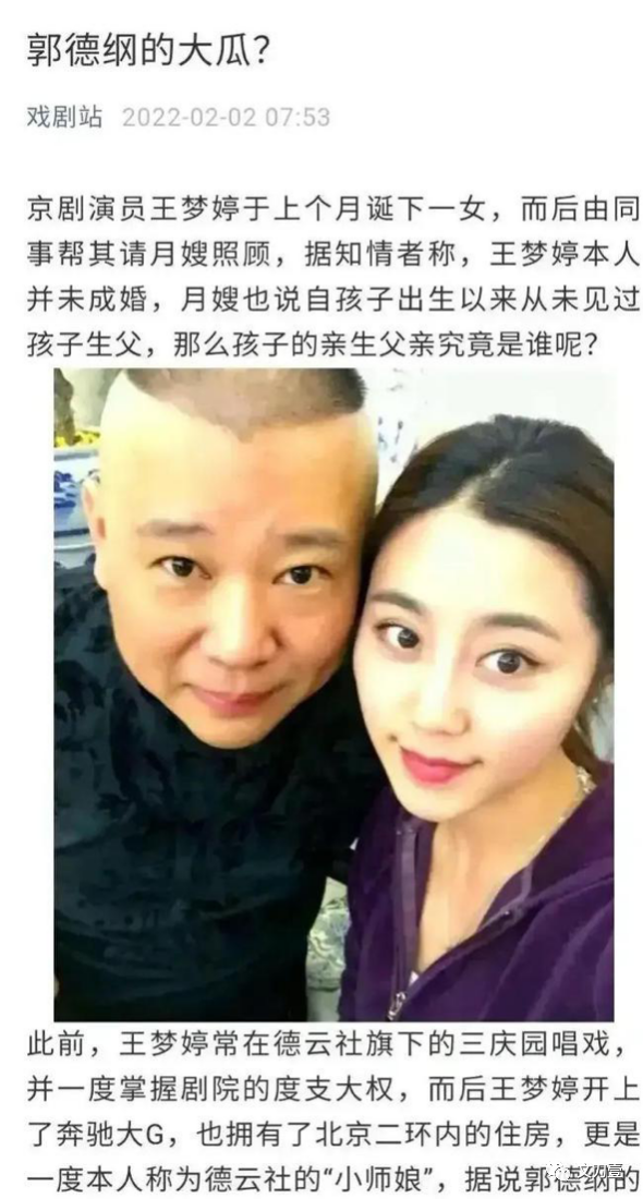文章标题赫然写着“郭德纲大瓜”,并声称他和王梦婷私下有一女。