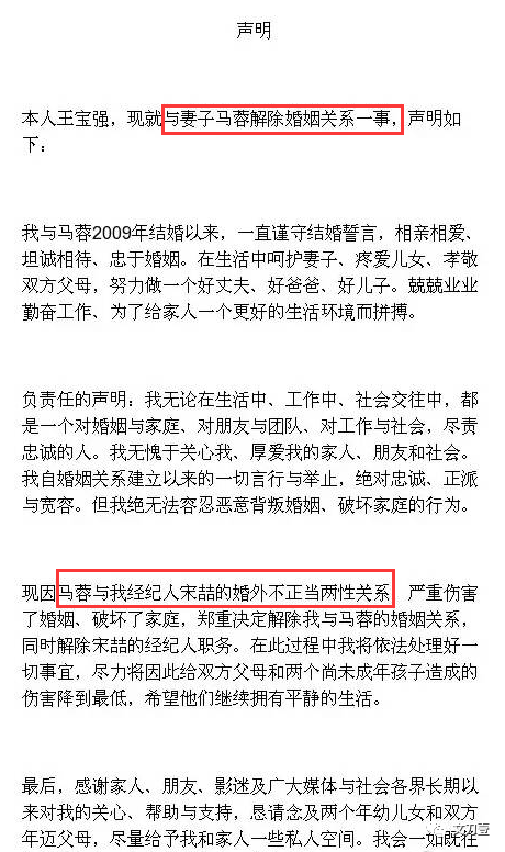 声明中提到马蓉与他的经纪人宋哲发生婚外不正当关系。