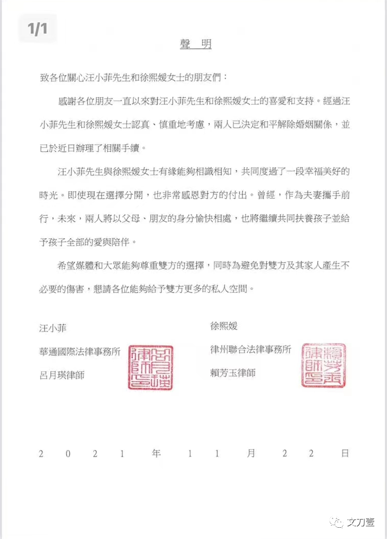 两人在进入婚姻的第11个年头时,画上了句号。
