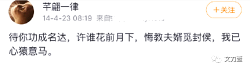 她发文:“待你功成名达,许谁花前月下,悔教夫婿觅封侯,我已心猿意马。”
