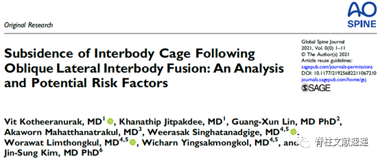 1.KotheeranurakVit,JitpakdeeKhanathip,LinGuangXunetal.SubsidenceofInterbodyCageFollowingObliqueLateralInterbodyFusion:AnAnalysisandPotentialRiskFactors.[J].GlobalSpineJ,2021,undefined:21925682211067210.